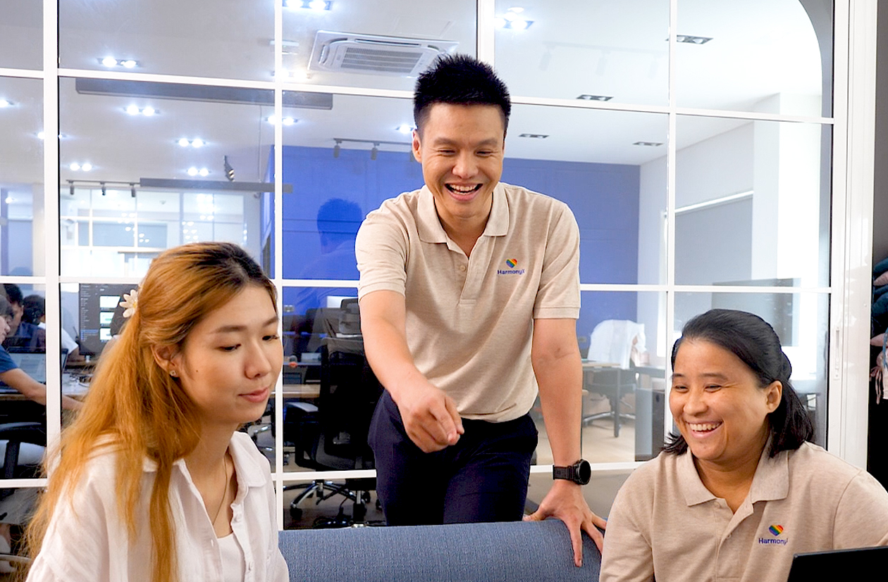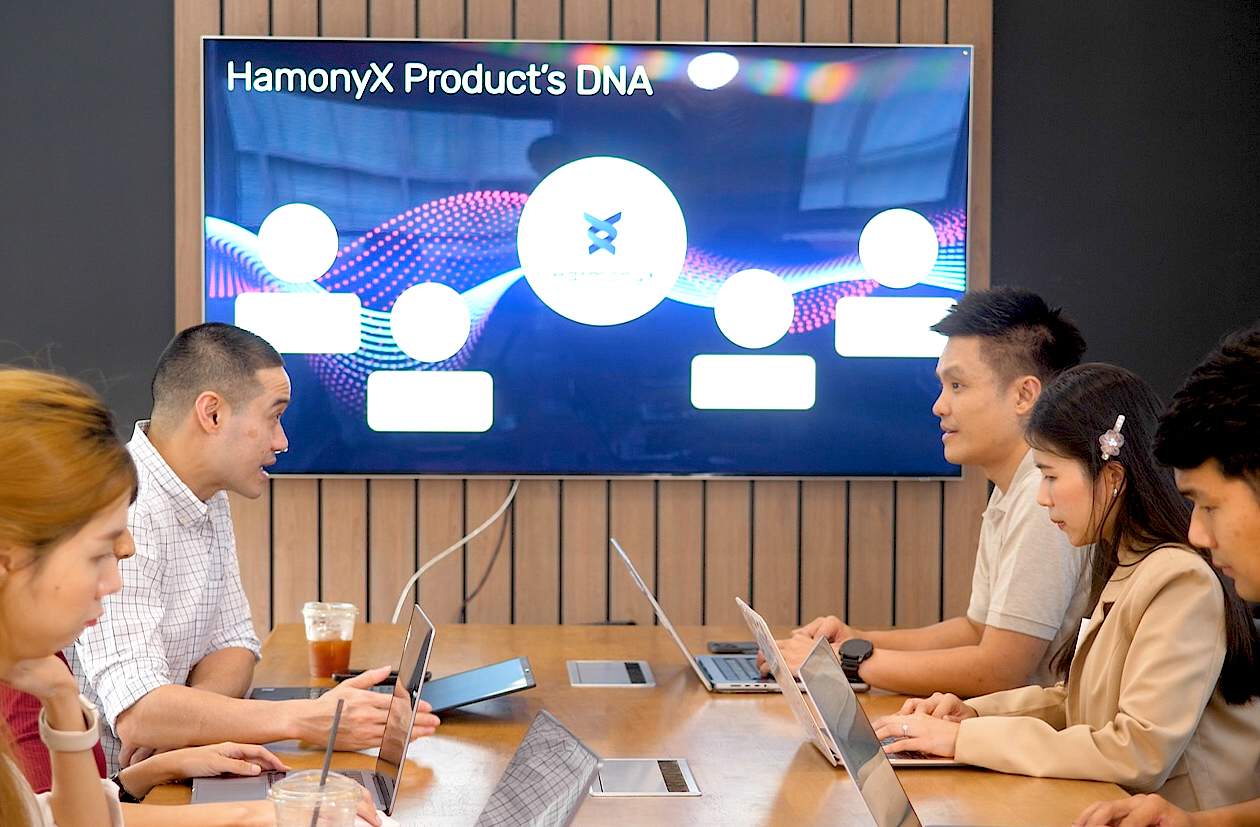 จุดเริ่มต้นจริงๆ คืออยากให้ HarmonyX เป็นบริษัทที่คนกับเทคโนโลยี สามารถสอดคล้องประสานกันได้อย่างลงตัวและเติบโตไปด้วยกัน เราค้นพบว่าสิ่งที่จะเปลี่ยนแปลงได้ในยุคนี้ ทําให้คนธรรมดาติดอาวุธ ติดจรวดได้ คือ ต้องมีเทคโนโลยี เพราะฉะนั้น การที่คนจะสามารถทํางานควบคู่กับเทคโนโลยีหรือเครื่องมือต่างๆ ให้ดีขึ้น จะทําอย่างไรให้มันง่าย เราเลยมาเป็นส่วนหนึ่งในการทําให้การใช้เทคโนโลยี ทํางานกับคน ได้ง่ายขึ้นแล้วเข้าถึงกับทุกๆ คน เพื่อเป็นแรงผลักดันให้ผู้ประกอบการ แล้วก็ผู้ทําธุรกิจต่างๆ ได้เติบโต และใช้เทคโนโลยีได้อย่างมีประสิทธิภาพสูงสุด