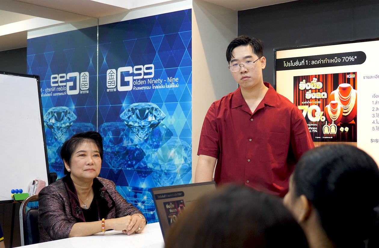 คุณสมใจ : เริ่มต้นคุณพ่อเป็นช่างทอง ทำทองส่งให้กับร้านทองที่เยาวราช หลังจากนั้นคุณพ่อคิดว่าอยากจะเปิดร้าน เพื่อรองรับงานด้วย ก็เลยได้เปิดร้านในชื่อ ซุ่ยเซ่งเฮง จนมาปี 2555 เพื่อเป็นการตอบรับต่อไลฟ์สไตล์ของคนรุ่นใหม่ จึงได้ไปเปิดสาขาแรกในนามของ โกลด์เด้น 99 แล้วต่อมาก็เปิดในห้างสรรพสินค้าต่างๆ มีถึง 34 สาขา ทั่วประเทศไทย เนื่องจากคุณแม่ดูแลธุรกิจนี้มานานกว่า 20 ปี ก็คิดว่าอยากจะส่งต่อให้ลูก เนื่องจากไลฟ์สไตล์เปลี่ยนแปลงไป รูปแบบของธุรกิจเปลี่ยนแปลงไป ก็คิดว่าเขาน่าจะทำได้ดีกว่ารุ่นคุณแม่
