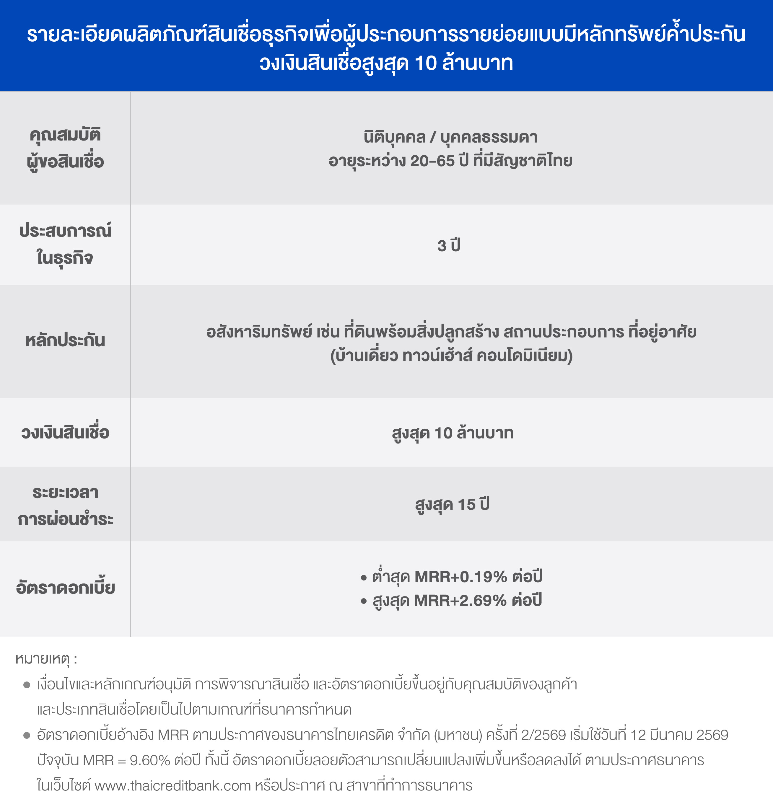 ข้อมูลผลิตภัณฑ์สินเชื่อเพื่อธุรกิจ Micro SME ธนาคารไทยเครดิต จำกัด (มหาชน) (Product Catalog) (เริ่มใช้วันที่ 12 มี.ค. 69) |