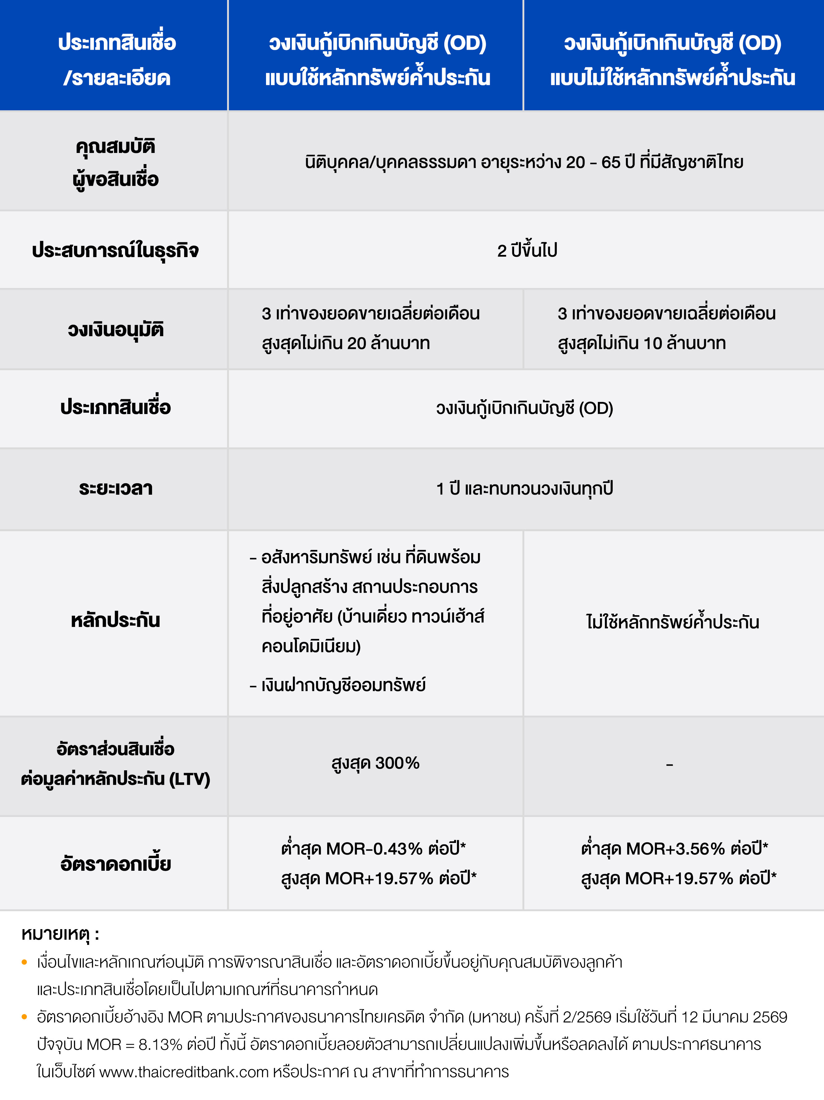 เป็นสินเชื่อเพื่อผู้ประกอบการ SME ที่ต้องการวงเงินเบิกเกินบัญชี ซึ่ง SME กล้าให้ Standby OD ซึ่งสินเชื่อวงเงินเบิกเกินบัญชีเหมาะสำหรับผู้ประกอบการรายย่อย เพื่อใช้เป็นเงินทุนหมุนเวียน และเสริมสภาพคล่องในการดำเนินธุรกิจ ค้ำประกันโดย บสย.